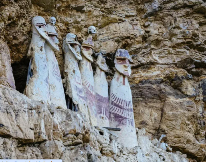 The Chachapoyas are also known for their impressive cliff tombs, such as the striking sarcophagi of Carajia, also located in the Utcubamba Valley. Perched perilously on a sheer cliff face, the sarcophagi are human-shaped and tall, each up to 2.5 meters high. Their vertiginous position is believed to be a deterrent to looters, as well as a way of preserving the dead in eternal watch over the valley. Carajia has been recognised as part of the UNESCO-listed cultural heritage of the region.